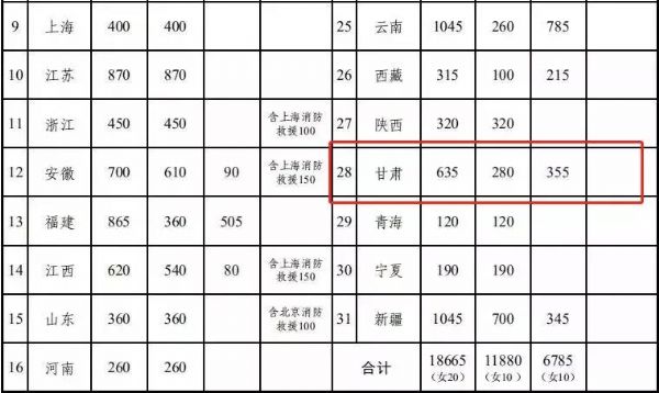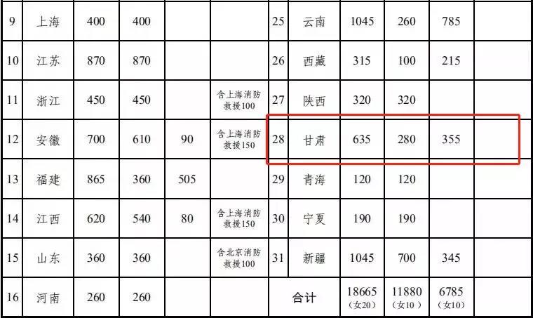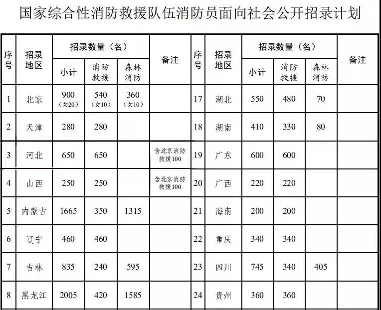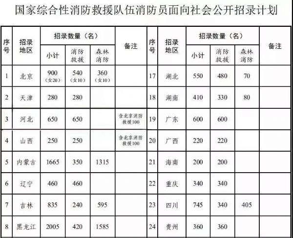 经应急管理部、人力资源社会保障部批准,此次国家综合性消防救援队伍面向社会公开招录消防员18665名,其中:消防救援队伍招录11880名,森林消防队伍招录6785名。各省(自治区、直辖市)招录计划见下表。